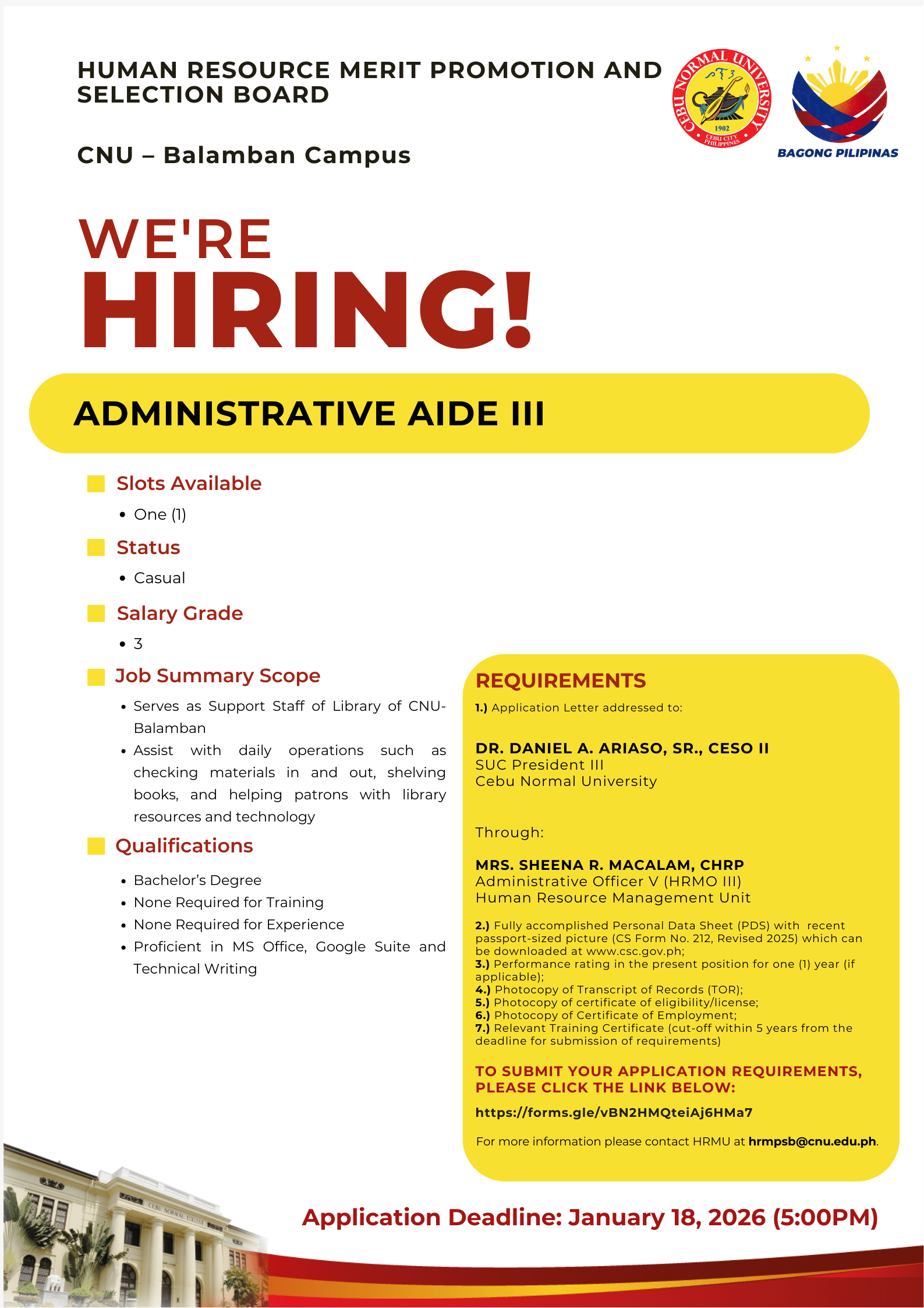 | BALAMBAN - CAMPUS | CNU-Balamban Campus | Administrative Aide III | N/A | Casual | January 8, 2026 | January 18, 2026 | DETAILS | https://forms.gle/vBN2HMQteiAj6HMa7 |