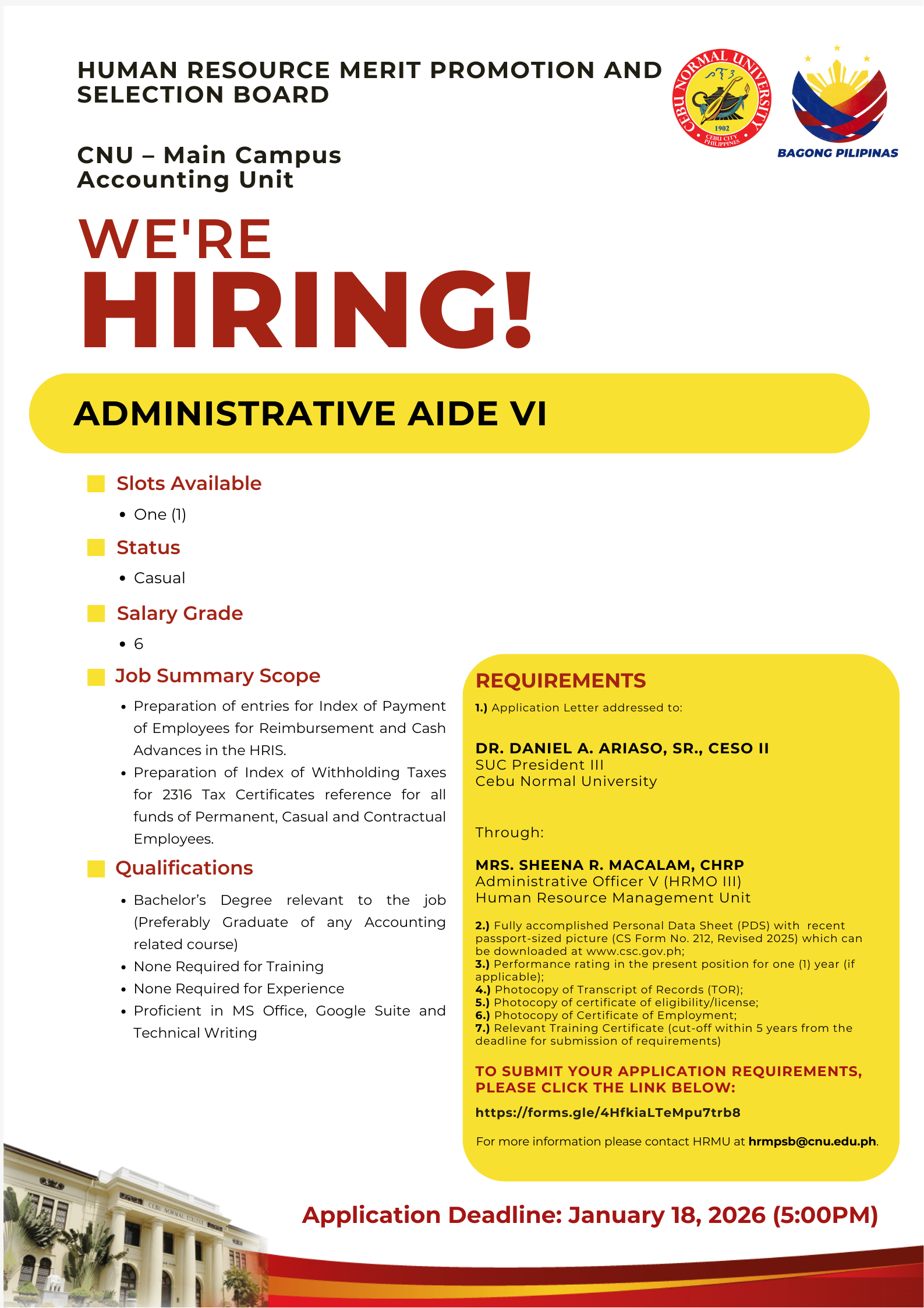 | MAIN - CAMPUS | Accounting Unit | Administrative Aide VI | N/A | Casual | January 8, 2026 | January 18, 2026 | DETAILS | https://forms.gle/4HfkiaLTeMpu7trb8 |