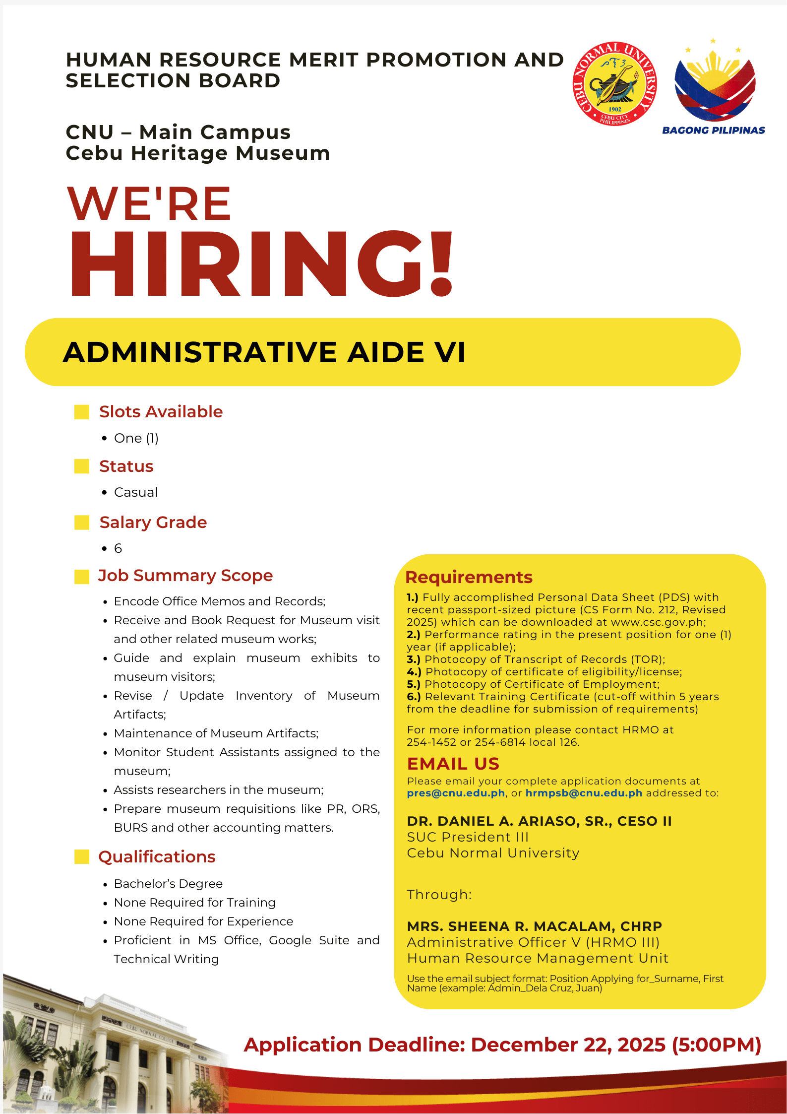 | MAIN - CAMPUS | Cebu Heritage Museum | Administrative Aide VI | N/A | Casual | December 12, 2025 | December 22, 2025 | DETAILS |