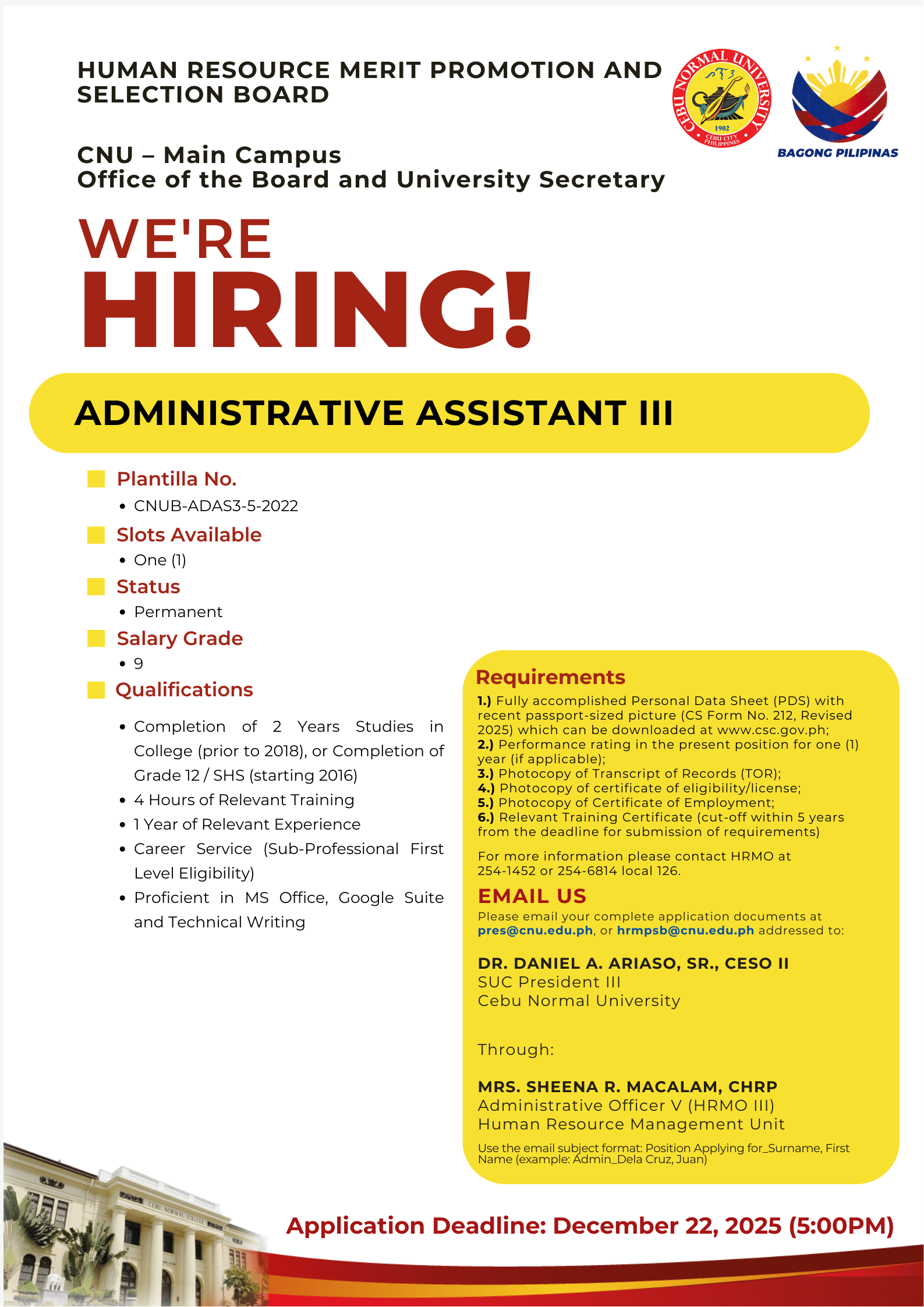 | MAIN - CAMPUS | Office of the Board and University Secretary | Administrative Assistant III | CNUB-ADAS3-5-2022 | Permanent | December 12, 2025 | December 22, 2025 | DETAILS |
