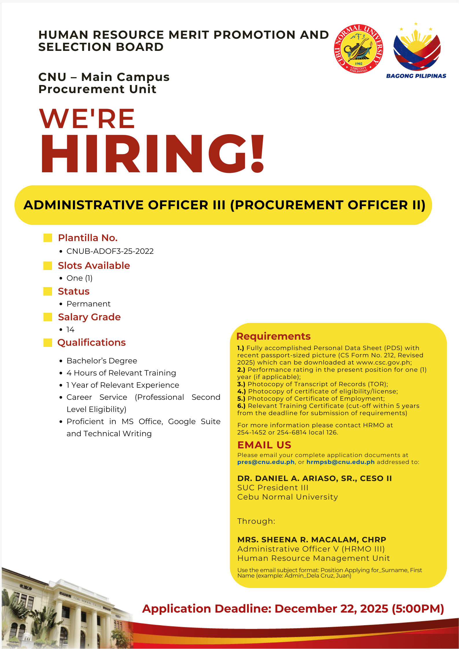 | MAIN - CAMPUS | Procurement Unit | Administrative Officer III (Procurement Officer II) | CNUB-ADOF3-25-2022 | Permanent | December 12, 2025 | December 22, 2025 | DETAILS |