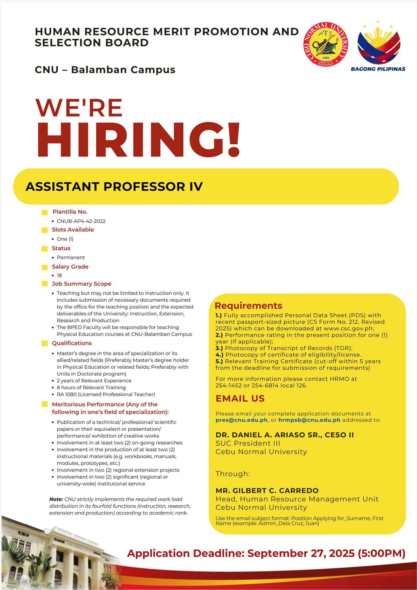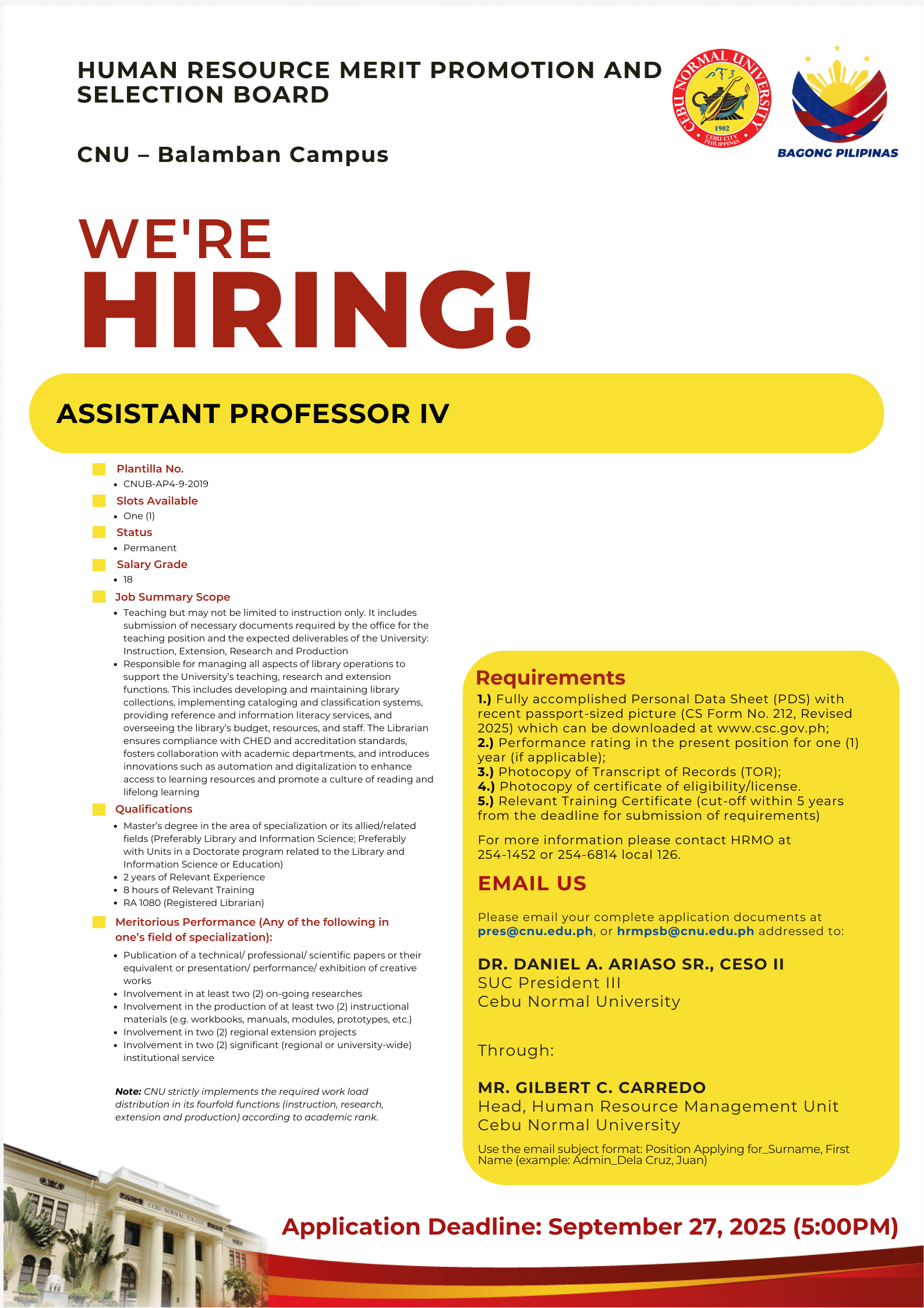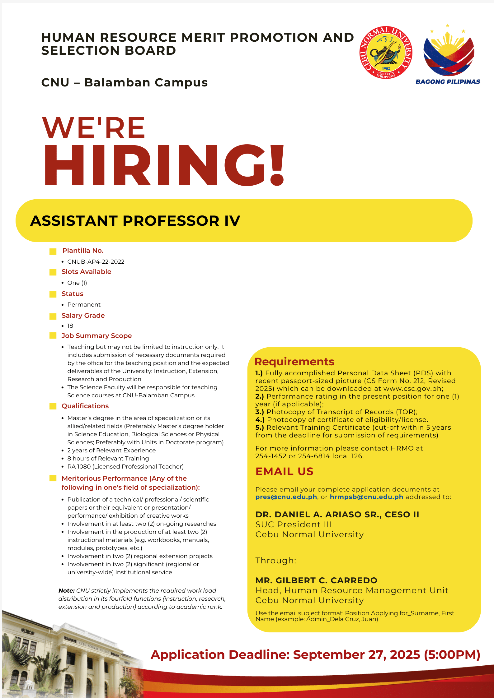| BALAMBAN - CAMPUS | CNU-Balamban Campus | Assistant Professor IV | CNUB-AP4-42-2022 | Permanent | September 17, 2025 | September 27, 2025 | DETAILS |