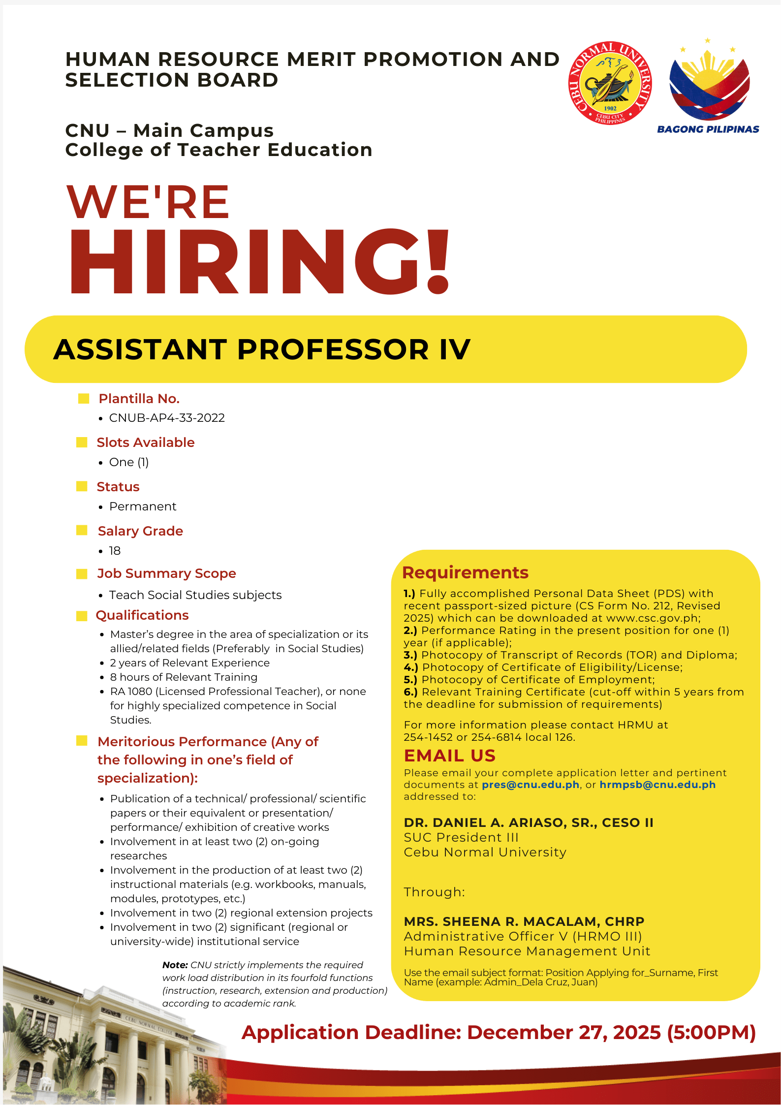 | MAIN - CAMPUS | College of Teacher Education | Assistant Professor IV | CNUB-AP4-33-2022 | Permanent | December 17, 2025 | December 27, 2025 | DETAILS |