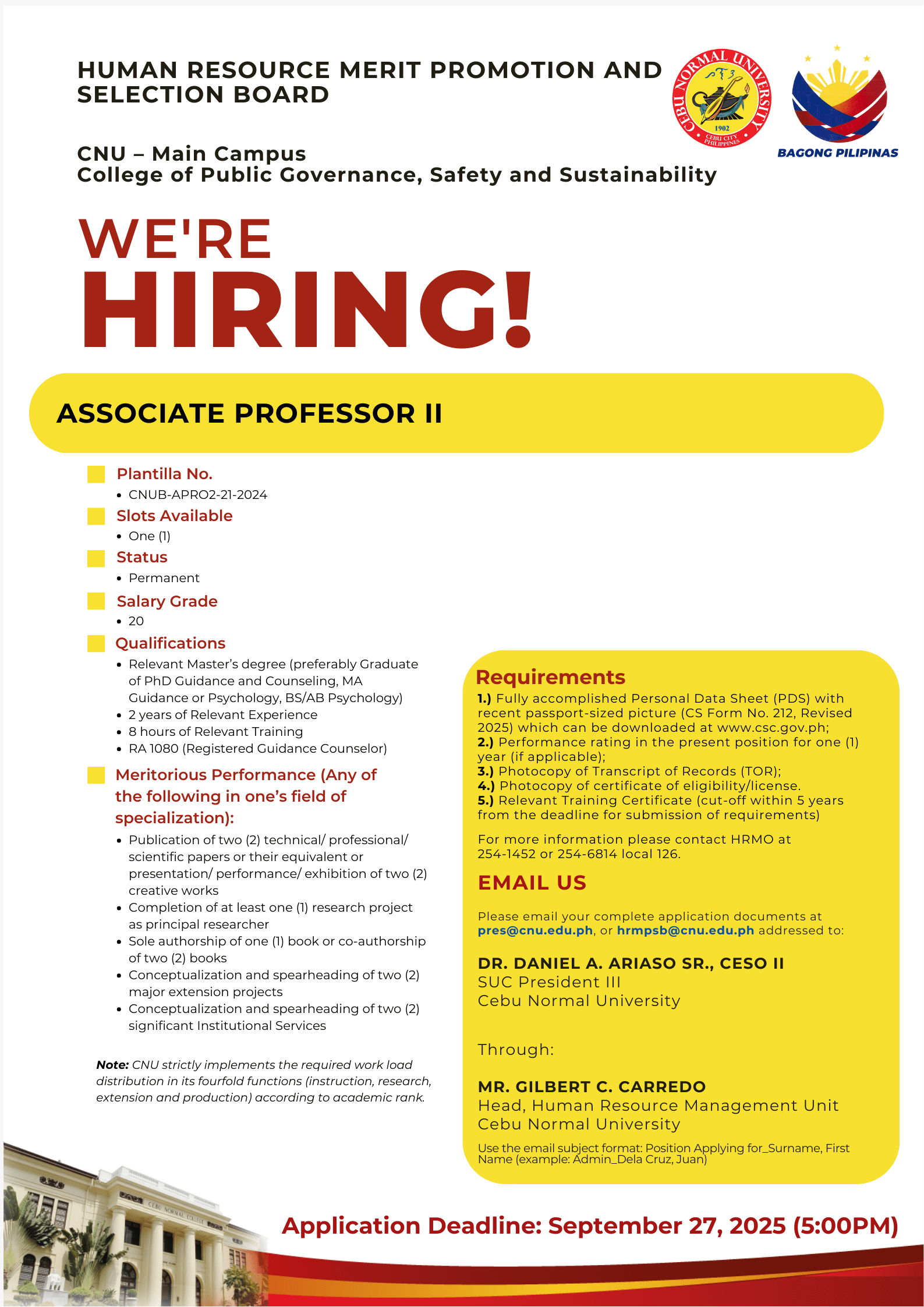 | MAIN - CAMPUS | College of Public Governance, Safety and Sustainability | Associate Professor II | CNUB-APRO2-21-2024 | Permanent | September 17, 2025 | September 27, 2025 | DETAILS |