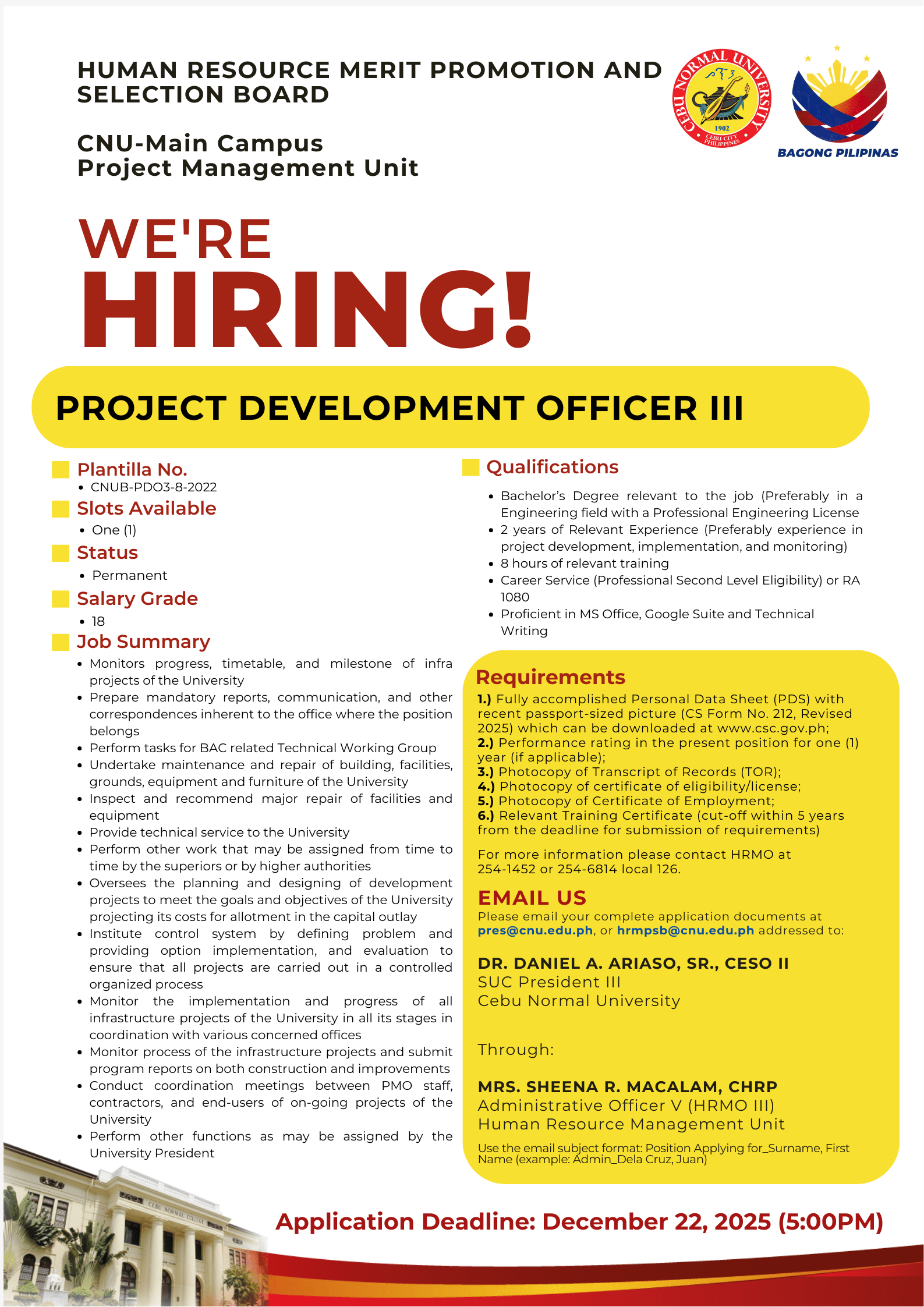 | MAIN - CAMPUS | Project Management Unit | Project Development Officer III | CNUB-PDO3-8-2022 | Permanent | December 12, 2025 | December 22, 2025 | DETAILS |