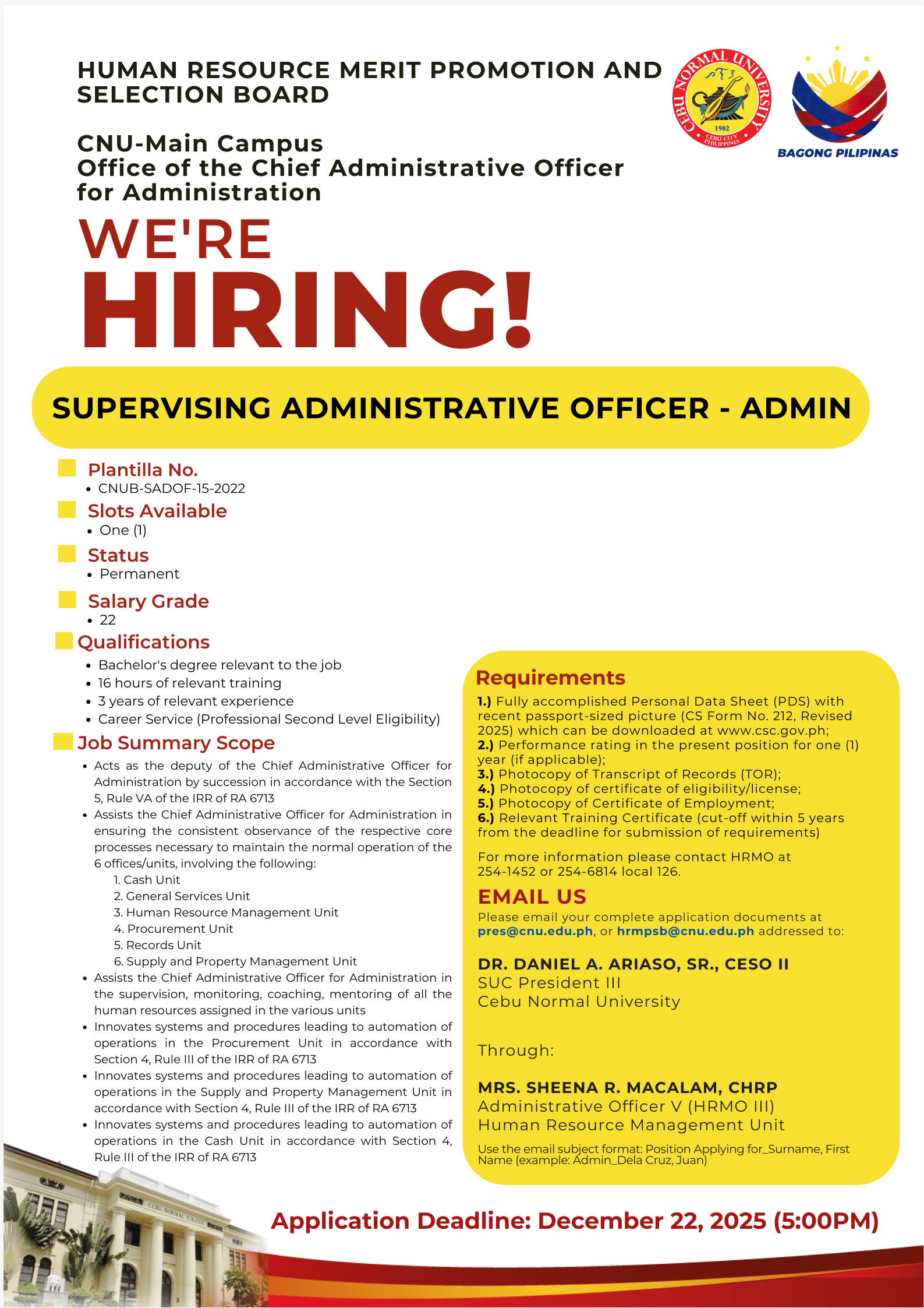 | MAIN - CAMPUS | Office of the Chief Administrative Officer for Administration | Supervising Administrative Officer - Admin | CNUB-SADOF-15-2022 | Permanent | December 12, 2025 | December 22, 2025 | DETAILS |