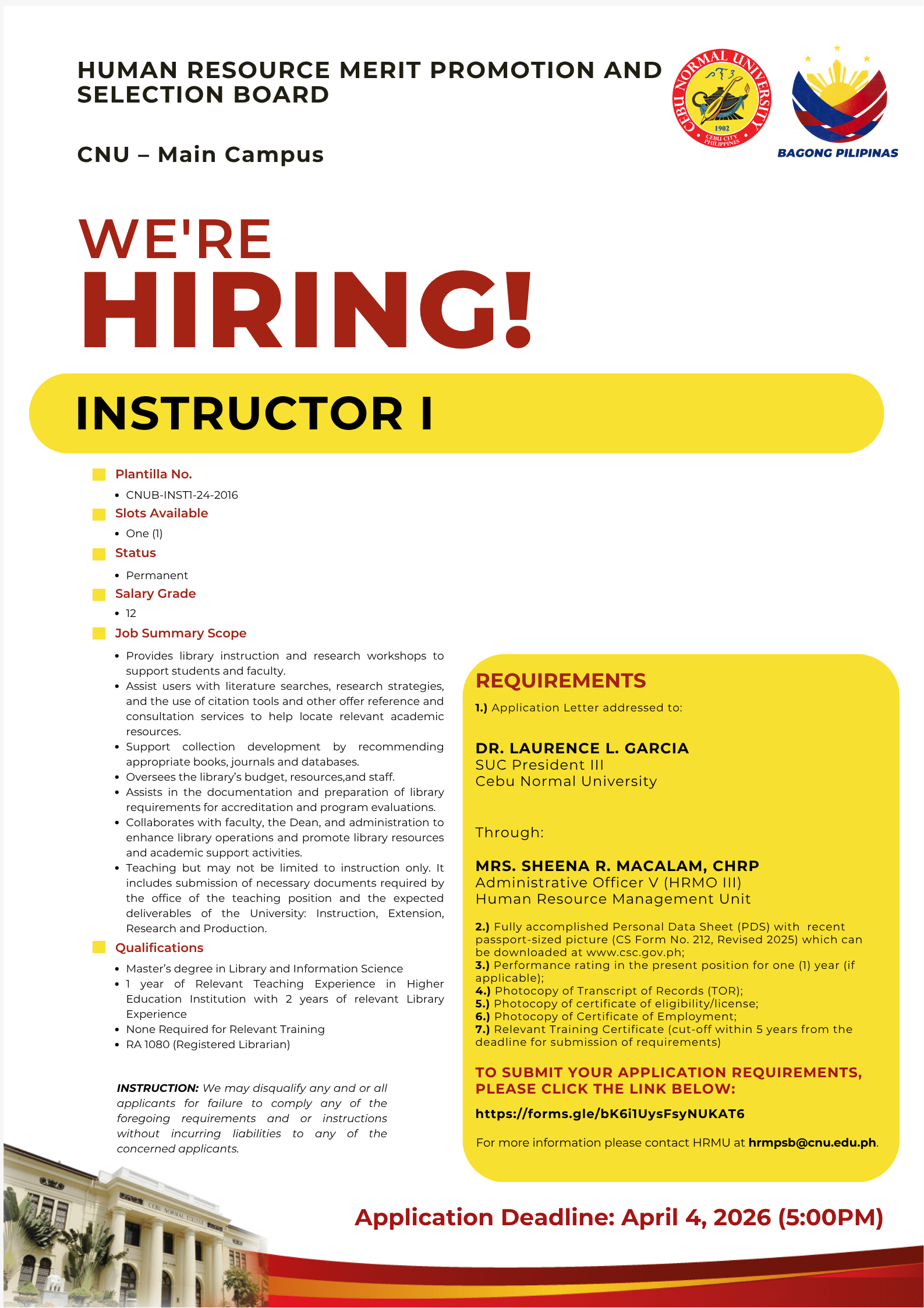 | MAIN - CAMPUS | Instructor I | CNUB-INST1-24-2016 | Permanent | March 25, 2026 | April 4, 2026 | DETAILS | https://forms.gle/bK6i1UysFsyNUKAT6 | |