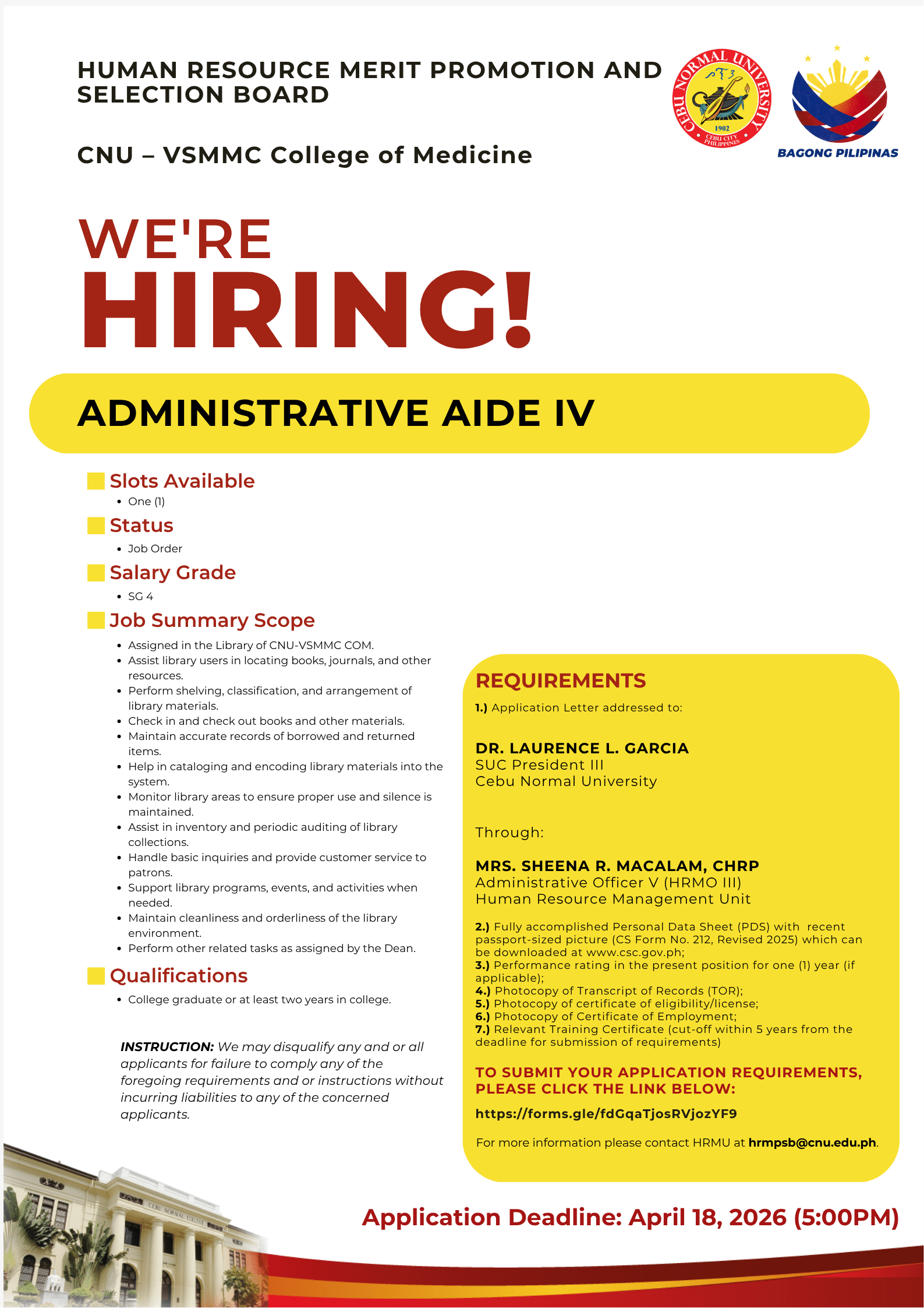 | MAIN - CAMPUS | CNU-VSMMC College of Medicine | Administrative Aide IV | N/A | Job Order | April 8, 2026 | April 18, 2026 | DETAILS | https://forms.gle/K1j1Bg72VCffhgyQ6 |