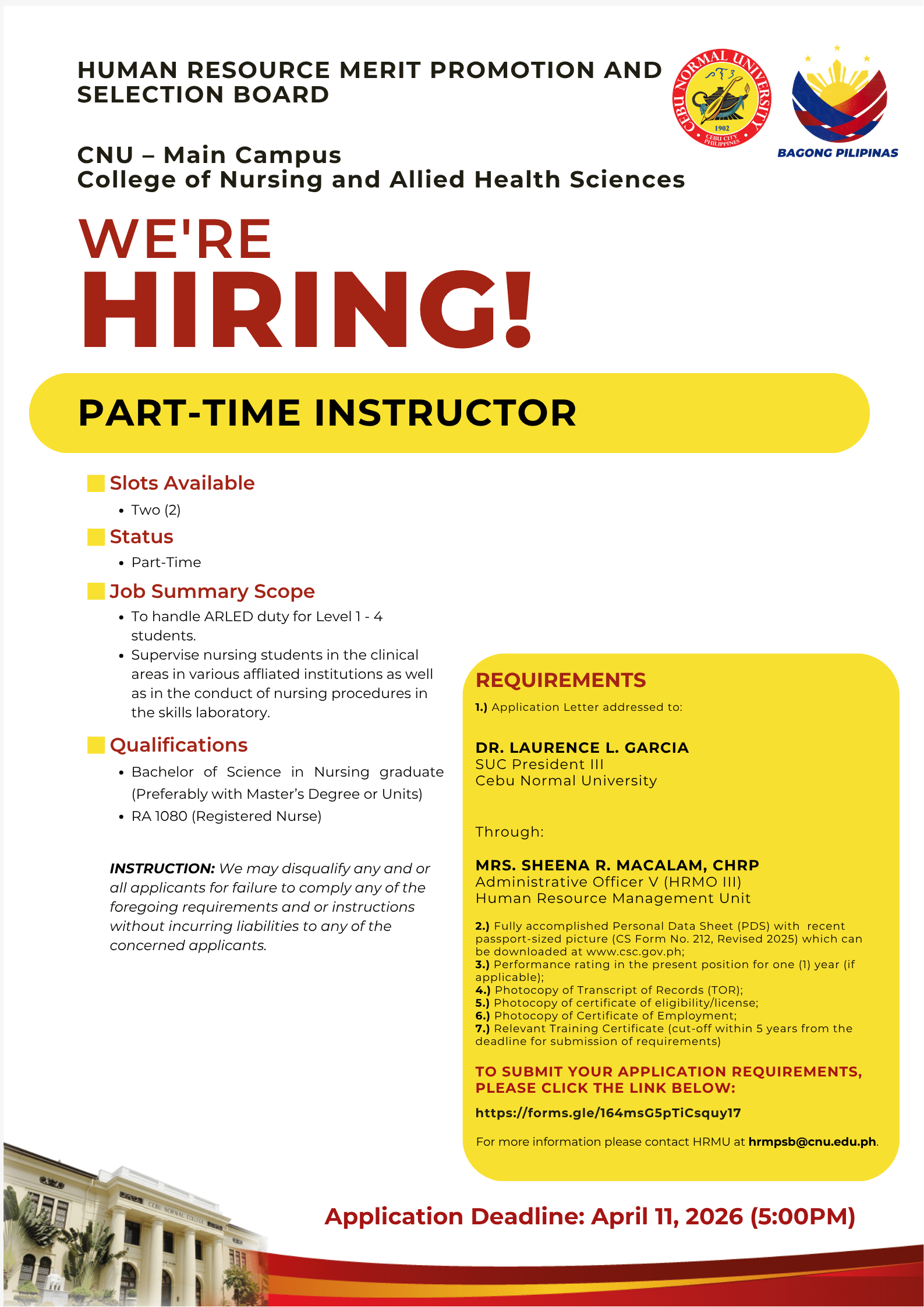 | MAIN - CAMPUS | College of Nursing and Allied Health Sciences | Part-Time Instructor | N/A | Part-Time | April 8, 2026 | April 11, 2026 | DETAILS | https://forms.gle/164msG5pTiCsquy17 |
