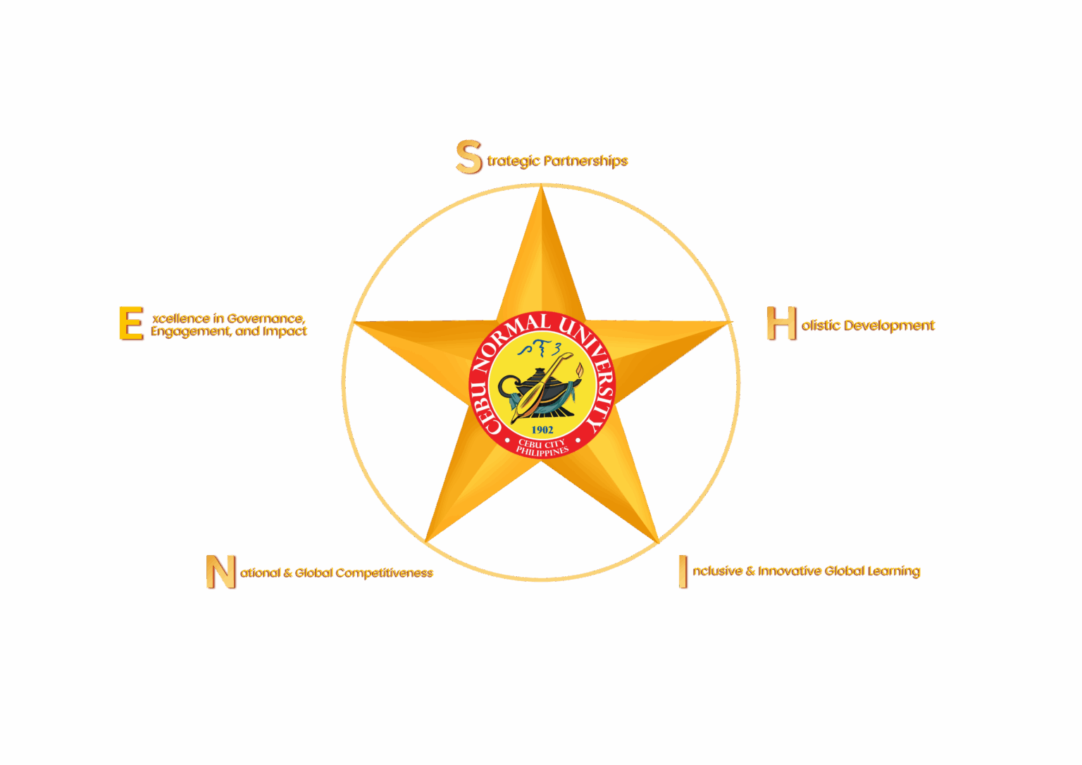 The I-SHINE strategy for 2024-2030 aims to boost Internationalization at Cebu Normal University by focusing on five pillars, each with its own sets of priority initiatives: (1) Strategic Partnerships, (2) Holistic Development, (3) Inclusive & Innovative Global Learning, (4) National & Global Competitiveness, and (5) Excellence in Governance, Engagement, and Impact. These pillars are anchored on the following foundations: the Bagong Pilipinas vision, the Philippine Development Plan 2023-2028, AmBisyon Nation 2040, ASEAN Integration, and the CHED A.C.H.I.E.V.E. Agenda, with adherence to the policy framework on the internationalization of Philippine Higher Education (CMO No. 55 s. 2016). The pillars are visually represented through the five points of the I-SHINE star: